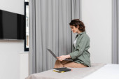 Zdjęcie "młoda kobieta medytująca na podwójne łóżko w pobliżu przyjaciół z laptopem w przytulnym pokoju hostelu studentów" może być wykorzystywane do celów osobistych i komercyjnych zgodnie z warunkami zakupionej licencji Royalty-free. Obraz jest dostępny do pobrania w jakości wysokiej rozdzielczości do 5760x3840.