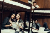 wesoły wielokulturowych studentów rozmawiających na dwupiętrowym łóżku w przytulnym pokoju hostelu, podróżników