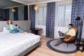 Zdjęcie "młody człowiek w słuchawkach rozmawia z wielokulturowych przyjaciół odpoczynku w komfortowym hostelu studentów" może być wykorzystywane do celów osobistych i komercyjnych zgodnie z warunkami zakupionej licencji Royalty-free. Obraz jest dostępny do pobrania w jakości wysokiej rozdzielczości do 5760x3840.