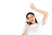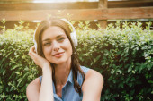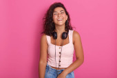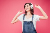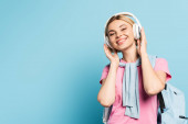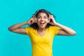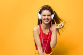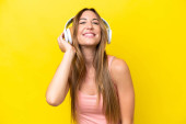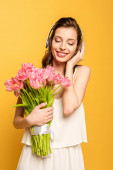 polerowana radosna kobieta z krótkimi blond włosami i słuchawkami ciesząca się muzyką na żółtym tle