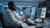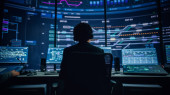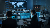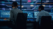 Profesjonalny Specjalista ds. Wsparcia Technicznego IT i Programista Pracujący na komputerze w sterowni monitoringu z ekranami cyfrowymi. Pracownik Użyj słuchawki z Mic i rozmowy na wezwanie.