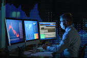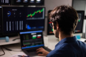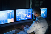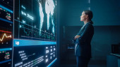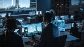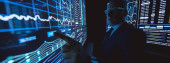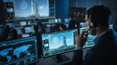 Profesjonalny Specjalista ds. Wsparcia Technicznego IT i Programista Pracujący na komputerze w sterowni monitoringu z ekranami cyfrowymi. Pracownik Użyj słuchawki z Mic i rozmowy na wezwanie.