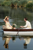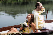 Mężczyzna i kobieta relaksują się na łodzi, gdy delikatnie ślizga się po wodzie, otoczeni spokojem natury..
