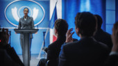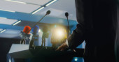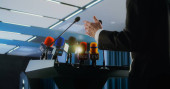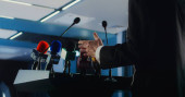 Dolly ujęcie przedstawiciela organizacji męskiej wypowiadając przemówienie z trybuny podczas kampanii prasowej w sali konferencyjnej. Polityk odpowiada na pytania, udziela wywiadu dla telewizji lub mediów.