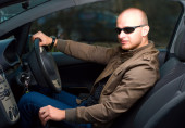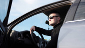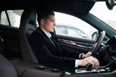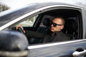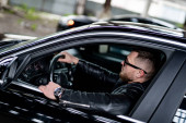 chłodny przedsiębiorca za kierownicą swojego samochodu