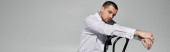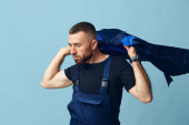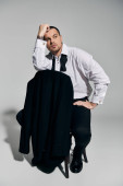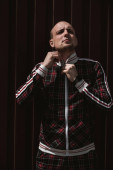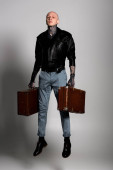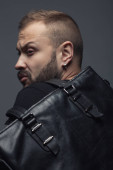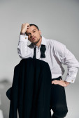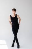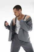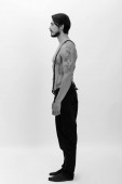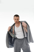 Mężczyzna z buzz cut i tatuaże w studio, noszenie biały top zbiornik, szelki, szara kurtka.