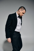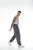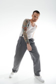 Zdjęcie "Mężczyzna z buzz cut i tatuaże w studio, noszenie biały top zbiornik, szelki, szara kurtka." może być wykorzystywane do celów osobistych i komercyjnych zgodnie z warunkami zakupionej licencji Royalty-free. Obraz jest dostępny do pobrania w jakości wysokiej rozdzielczości do 5760x3840.