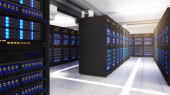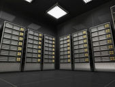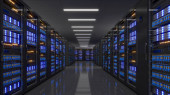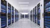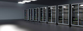 Strzał w centrum danych z wieloma rzędami w pełni operacyjnych stojaków serwerowych. Nowoczesna telekomunikacja, chłodzenie centrum danych, serwerownia, renderowanie 3d