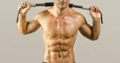 Silny kulturysta człowiek z doskonałe abs, barki, biceps, triceps i klatki piersiowej, osobisty trener fitness trening z hantlami ciężkie, zginając ramiona