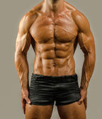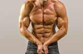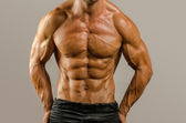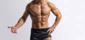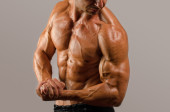 Silny kulturysta z sześciu pack. Silny kulturysta człowiek z doskonałe abs, barki, biceps, triceps i klatki piersiowej, osobisty trener fitness wyginanie mięśni