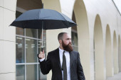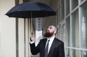 Młody człowiek z protezą nogi siedzi przy deszczowym oknie, trzymając parasol.