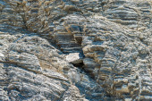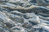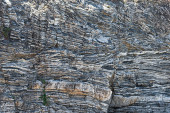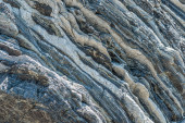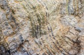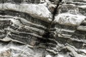 Siła natury skompresowane pęknięte warstwy skalne struktury tworzące zbliżenie szczegóły, w różnych kształtach, kolorach, grubościach, na południowym środkowym wybrzeżu Krety, Grecja. Natura, koncepcja nauki geologicznej