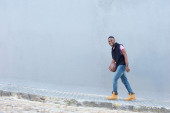 Szczęśliwy facet spacery i przy użyciu telefonu komórkowego