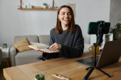 Atrakcyjny młody freelancer demonstruje techniki makijażu podczas angażowania się z publicznością online.