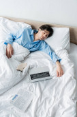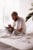 Zdjęcie "Młody mężczyzna uważnie śledzi poziom cukru we krwi w domu, relaksując się w łóżku.." może być wykorzystywane do celów osobistych i komercyjnych zgodnie z warunkami zakupionej licencji Royalty-free. Obraz jest dostępny do pobrania w jakości wysokiej rozdzielczości do 5760x3840.