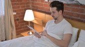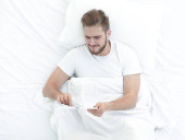 Młody mężczyzna uważnie śledzi poziom cukru we krwi w domu, relaksując się w łóżku..