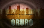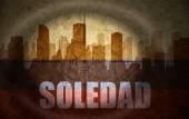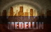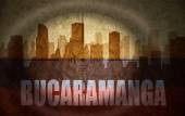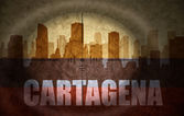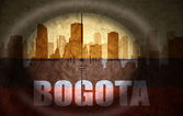 sniper scope aimed at the abstract silhouette of the city with text Cali at the vintage colombian flag. concept