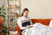 Kobieta siedzi na kanapie, popijając herbatę zagubioną w myślach, otoczona komfortowym wystrojem.