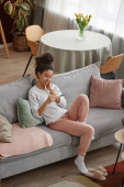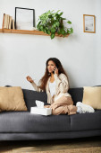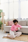 Zdjęcie "Kobieta siedzi na kanapie, popijając herbatę zagubioną w myślach, otoczona komfortowym wystrojem." może być wykorzystywane do celów osobistych i komercyjnych zgodnie z warunkami zakupionej licencji Royalty-free. Obraz jest dostępny do pobrania w jakości wysokiej rozdzielczości do 5760x3840.