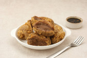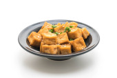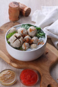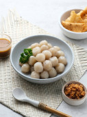 Siomay Bandung (Shumay) lub pierogi na parze z gotowanym tofu. Indonezyjski tradycyjny street food z sosem orzechowym.