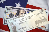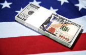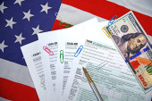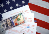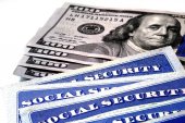Karta ubezpieczenia społecznego, my, skarbówka i banknoty walutowe na amerykańskiej fladze w tle. Obywatel USA, świadczenia, ssn, fundusze