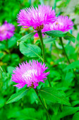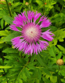 Centaurea dealbata perski lub wybielone chabry. Close-up piękny fioletowy kwiat w wiosennym ogrodzie na rozmytym zielonym tle. Selektywne skupienie z miejscem na tekst. Koncepcja projektowa