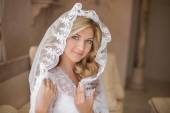Pięknej narzeczonej uśmiechający się w welon. Piękno portret. Szczęśliwy