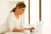 Zdjęcie "Kobieta z laptopem w domu" może być wykorzystywane do celów osobistych i komercyjnych zgodnie z warunkami zakupionej licencji Royalty-free. Obraz jest dostępny do pobrania w jakości wysokiej rozdzielczości do 5760x3840.
