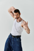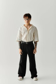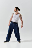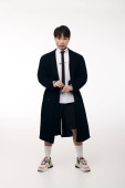 Zdjęcie "Młody Afroamerykanin pokazuje swój modny strój stojąc na fioletowym tle." może być wykorzystywane do celów osobistych i komercyjnych zgodnie z warunkami zakupionej licencji Royalty-free. Obraz jest dostępny do pobrania w jakości wysokiej rozdzielczości do 5760x3840.