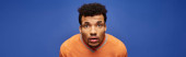 Młody Afroamerykanin pokazuje swój modny strój stojąc na fioletowym tle.