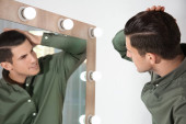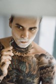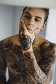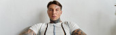 Wytatuowany młody mężczyzna stosuje przepaski na oczy, wyglądając na zrelaksowanego w przytulnym domu.