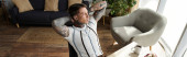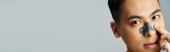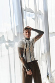 Zdjęcie "Wytatuowany młody mężczyzna stosuje przepaski na oczy, wyglądając na zrelaksowanego w przytulnym domu." może być wykorzystywane do celów osobistych i komercyjnych zgodnie z warunkami zakupionej licencji Royalty-free. Obraz jest dostępny do pobrania w jakości wysokiej rozdzielczości do 5760x3840.