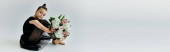 Stylowy młodzieniec z farbowanymi włosami w koszulce, ozdobiony pięknymi kwiatami w studiu, sztandar