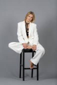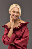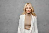 Urocza kobieta promieniuje ciepłem i stylem, ubrana w elegancki strój, w nowoczesnym otoczeniu.
