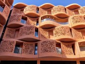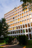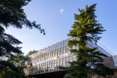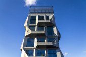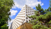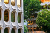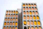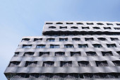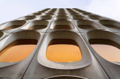 Fasada prefabrykowanego betonu modułowego na biurowcu funkcjonalistycznym CBR Building, Watermael-Boitsfort, Bussels, Belgia