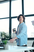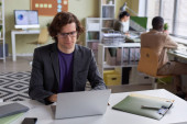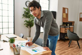 Handsome young man analyzes data and discusses reports while working in a sleek office setting.