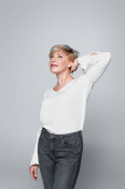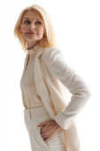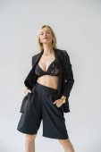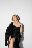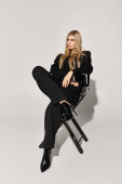 Zdjęcie "Blondynka pozuje pewnie w eleganckim czarnym stroju, łącząc modę i styl płynnie." może być wykorzystywane do celów osobistych i komercyjnych zgodnie z warunkami zakupionej licencji Royalty-free. Obraz jest dostępny do pobrania w jakości wysokiej rozdzielczości do 5760x3840.