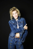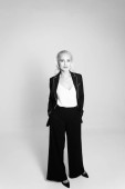 Blondynka pozuje pewnie w eleganckim czarnym stroju, łącząc modę i styl płynnie.