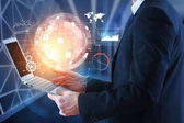 biznesmen przy użyciu komputera typu tablet pokazuje internet i sieć społeczną