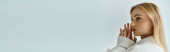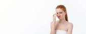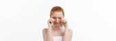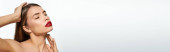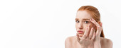 Młoda kobieta z oszałamiającymi czerwonymi włosami pokazuje swoje naturalne piękno w minimalistycznym studio, baner