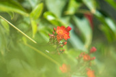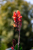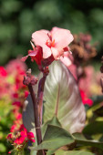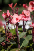 Różowy kwiat z zieloną łodygą. Kwiat jest w ogrodzie. Kwiat jest głównym celem obrazu