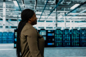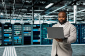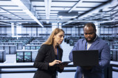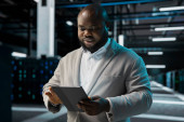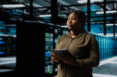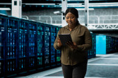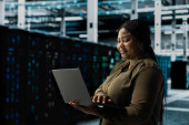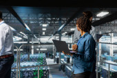 Zdjęcie "Inżynier centrum danych monitoruje komponenty sprzętowe pod kątem potencjalnych awarii, poprawiając stabilność systemu. Pracownik serwerowni konfigurujący ustawienia superkomputerów w celu zwiększenia niezawodności i czasu pracy" może być wykorzystywane do celów osobistych i komercyjnych zgodnie z warunkami zakupionej licencji Royalty-free. Obraz jest dostępny do pobrania w jakości wysokiej rozdzielczości do 5760x3840.