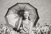 Woman with suitcase and umbrella standing on road between wheat over blue sky background