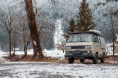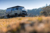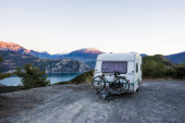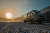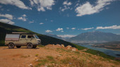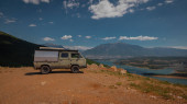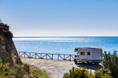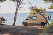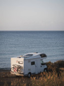 Vintage camper van przygoda jest zaparkowany na nadmorskim klifie o zmierzchu, z widokiem na spokojne błękitne morze z łagodnie oświetlone miasto i wzgórza w oddali, przywołując wolność, podróże i spokojny nastrój nad morzem.