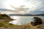 Zdjęcie "Vintage camper van przygoda jest zaparkowany na nadmorskim klifie o zmierzchu, z widokiem na spokojne błękitne morze z łagodnie oświetlone miasto i wzgórza w oddali, przywołując wolność, podróże i spokojny nastrój nad morzem." może być wykorzystywane do celów osobistych i komercyjnych zgodnie z warunkami zakupionej licencji Royalty-free. Obraz jest dostępny do pobrania w jakości wysokiej rozdzielczości do 5760x3840.