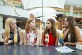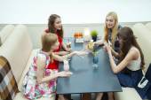 Grupa młodych kobiet siedzi przy stole jedzenia deser