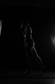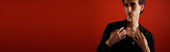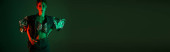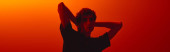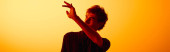 Przystojny mężczyzna pokazuje swój zmysł mody podczas pokazywania ruchu artystycznego w kreatywnym oświetleniu.