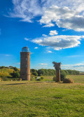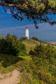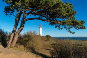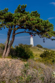 Latarnia morska Dornbusch na wyspie Hiddensee z nadmorskim krajobrazem i sosną