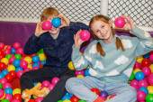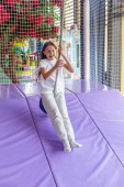 Uśmiechnięta dziewczyna lubi zjazdy w dół na jasnoróżowym nadmuchiwanym pierścieniu w bezpiecznym i kolorowym krytym placu zabaw przygoda.