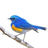 piękny niebieski i pomarańczowy ptak siedzący na gałęzi, Mężczyzna Niebieski-fronted redstart, Fenicurus frontalis, izolowany na białym tle